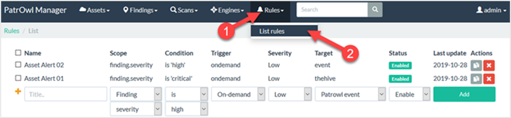 Audit discover manager alerting rules management view can be accessed from the Rules -> List rules. This view allows you to create, copy, update, delete, and change the functional status of the alerting rules.