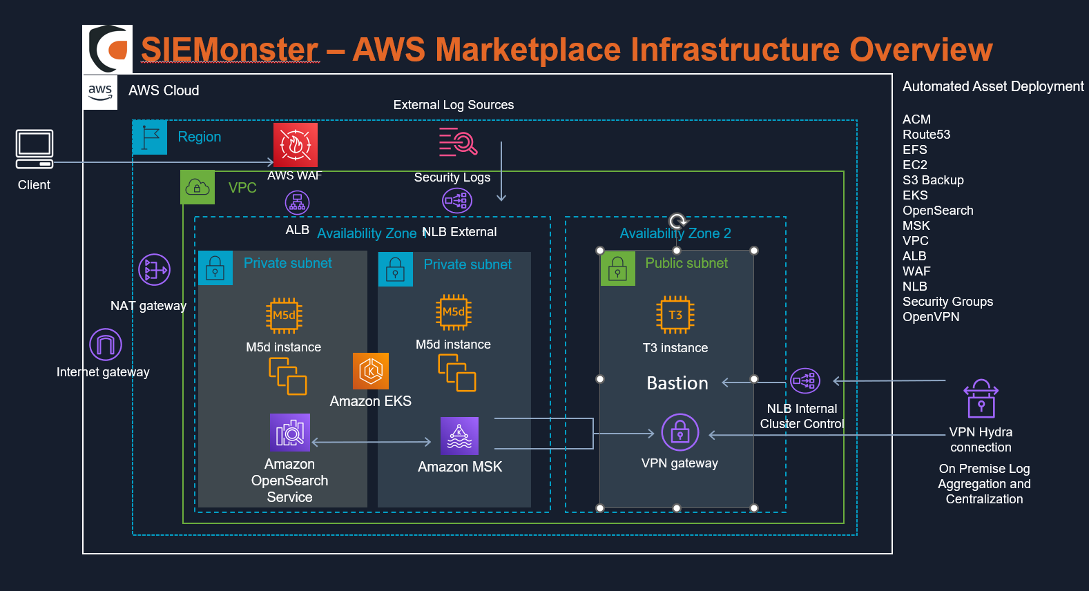 The following has been created to assist with the deployment of the AWS AMI SIEMonster implementation. The following will contain all relevant information on deploying the image provided and the configuration of the individual components as needed. This guide is limited to the deployment only, for any additional information, please consult the SIEMonster documentation.