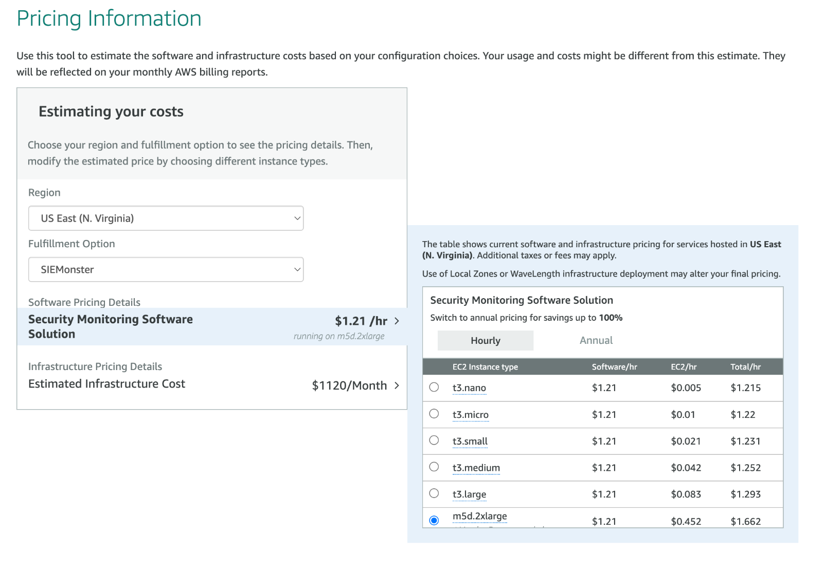 The AWS pricing may vary per region. Log into your AWS account and view the pricing chart in the AWS Marketplace for more information. Pricing includes the SIEMonster license, and no license management is required.