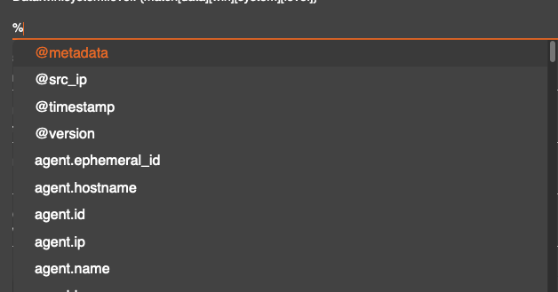 The variables can be access by pressing the % key, this will produce a drop down menu that supports scrolling or typing to find the preferred field.