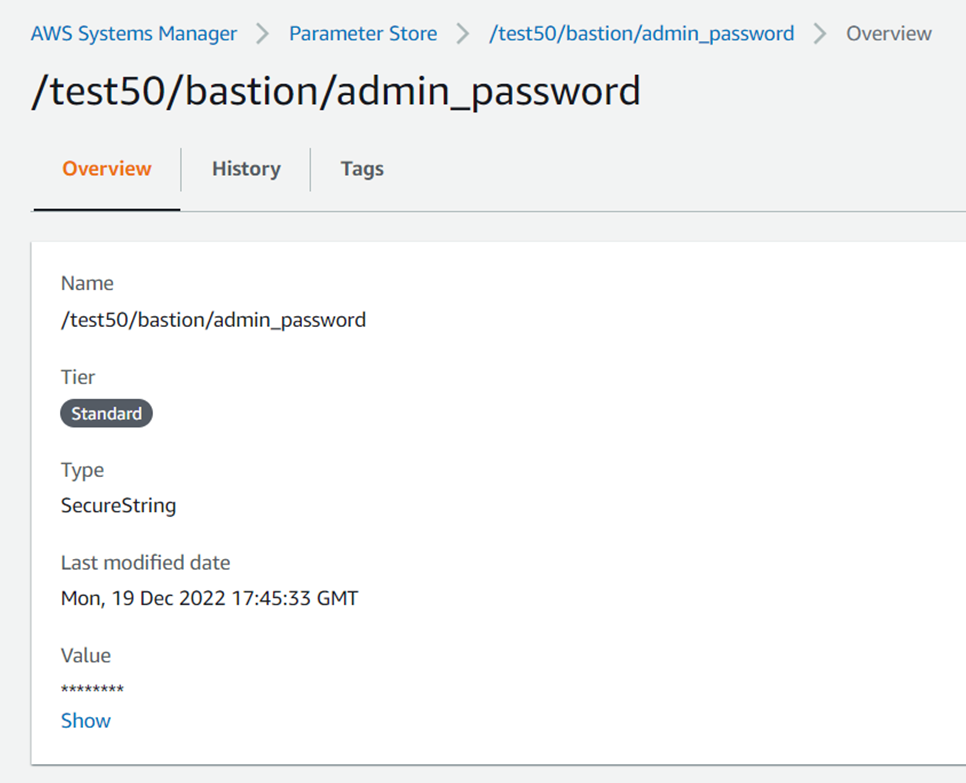 To extract the bastion password, you can log into the AWS console and go to AWS System manager > Parameter Store > <top_level_fqdn_prefix>/bastion/admin_password and Click “Show”. Please see example below.