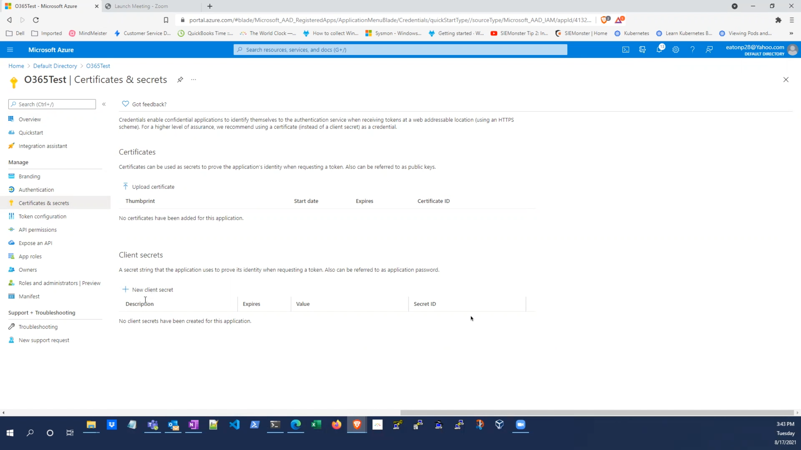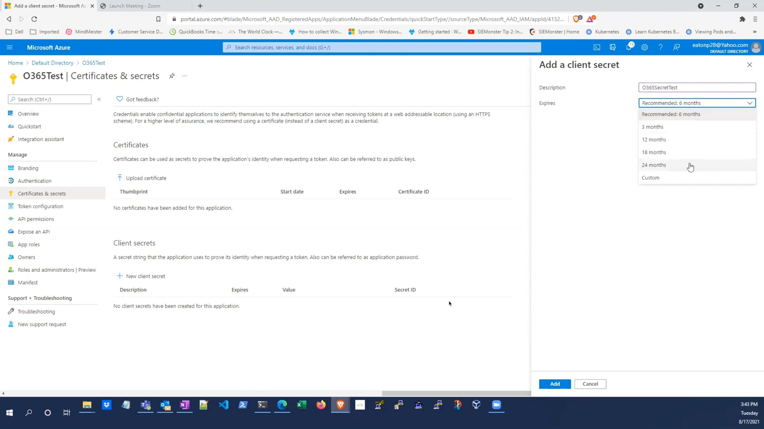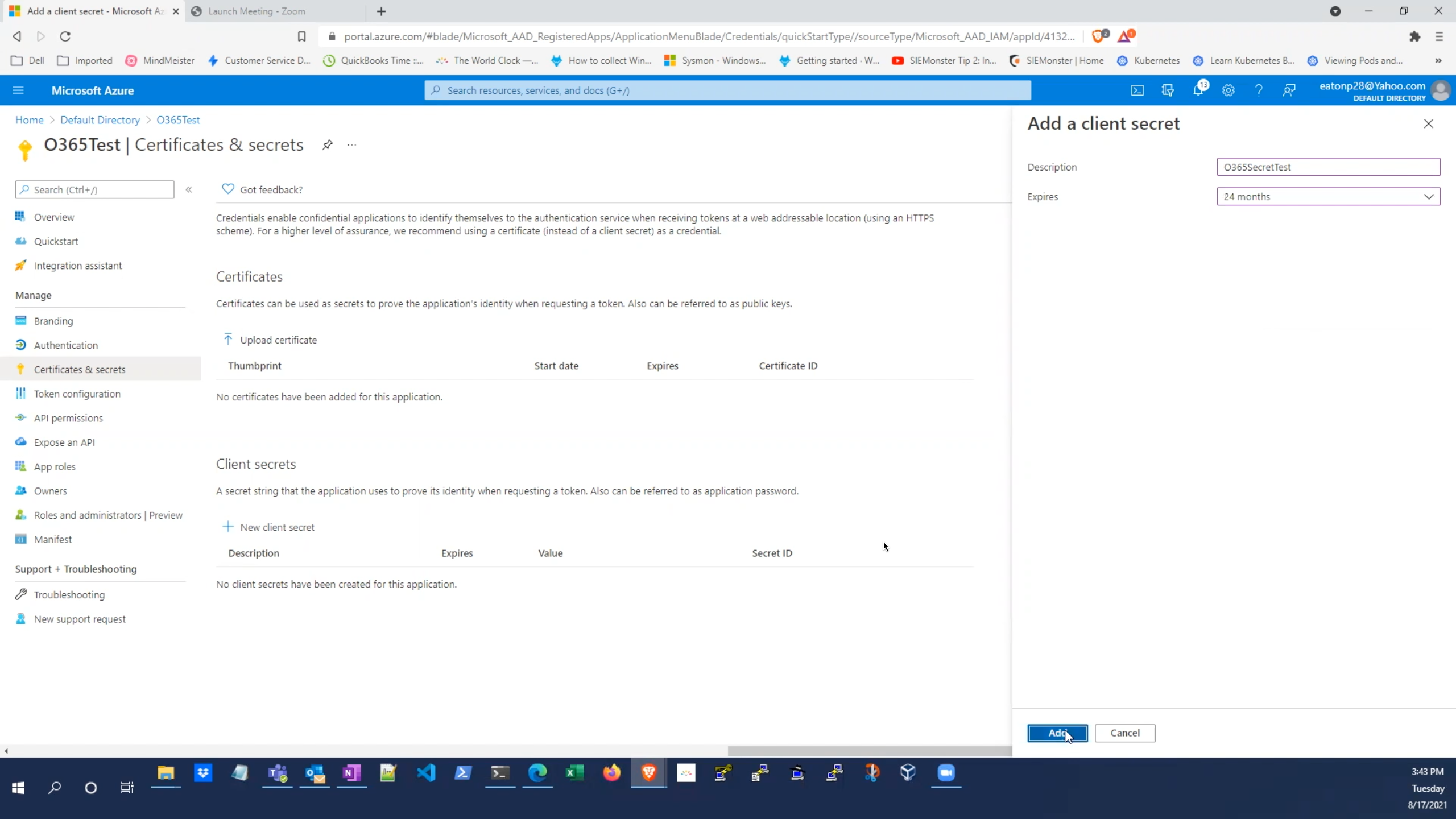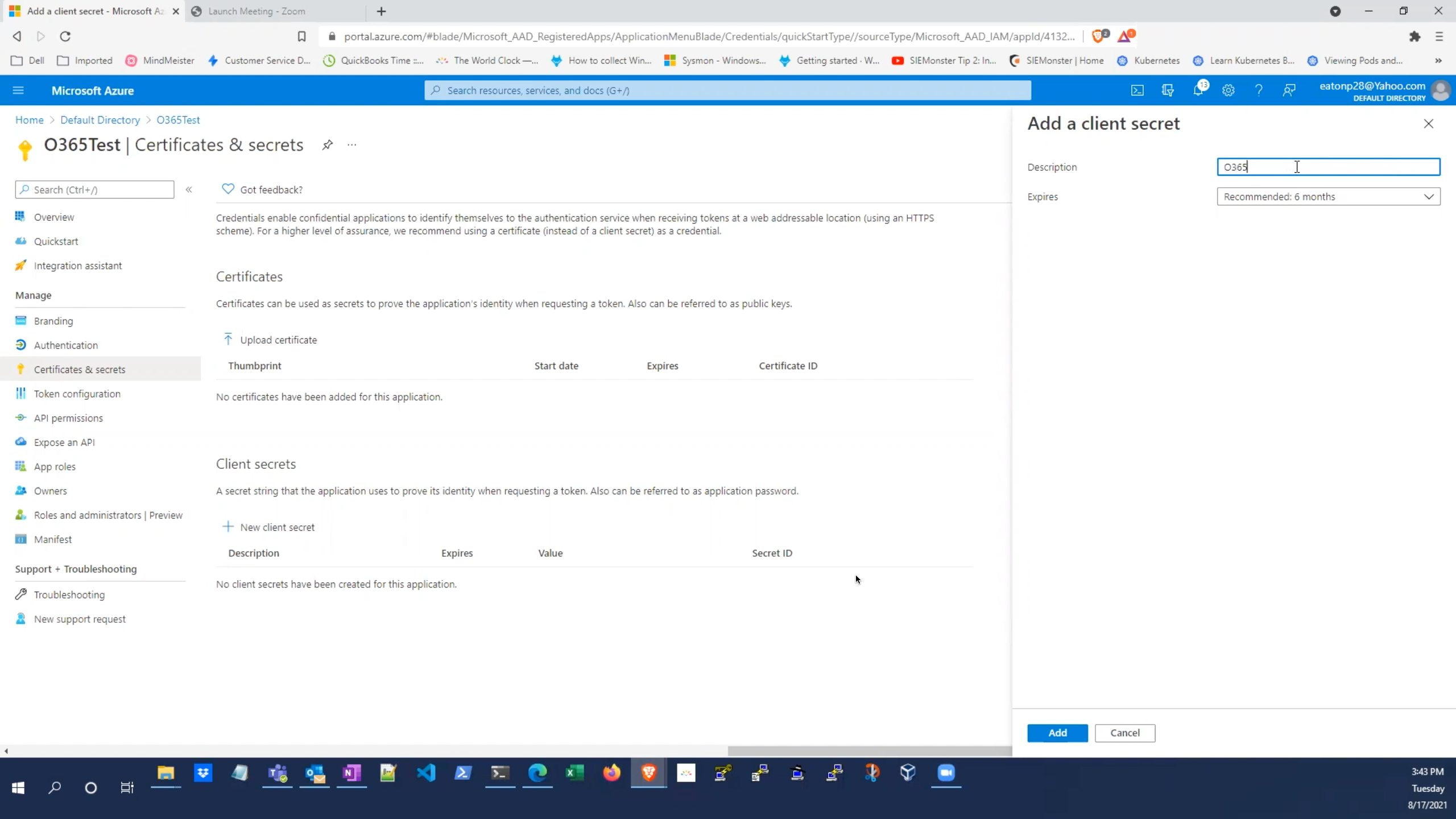 4. Enter the name, in this example we will just use 0365Test. Then Click Register