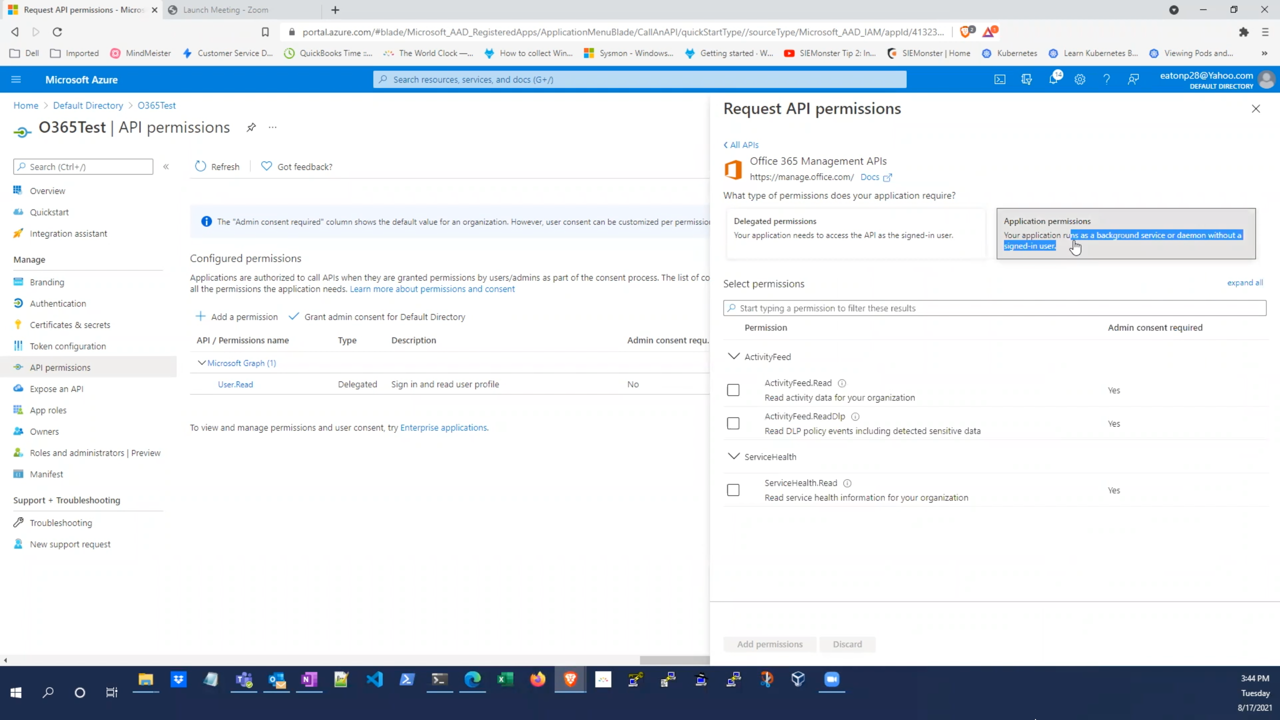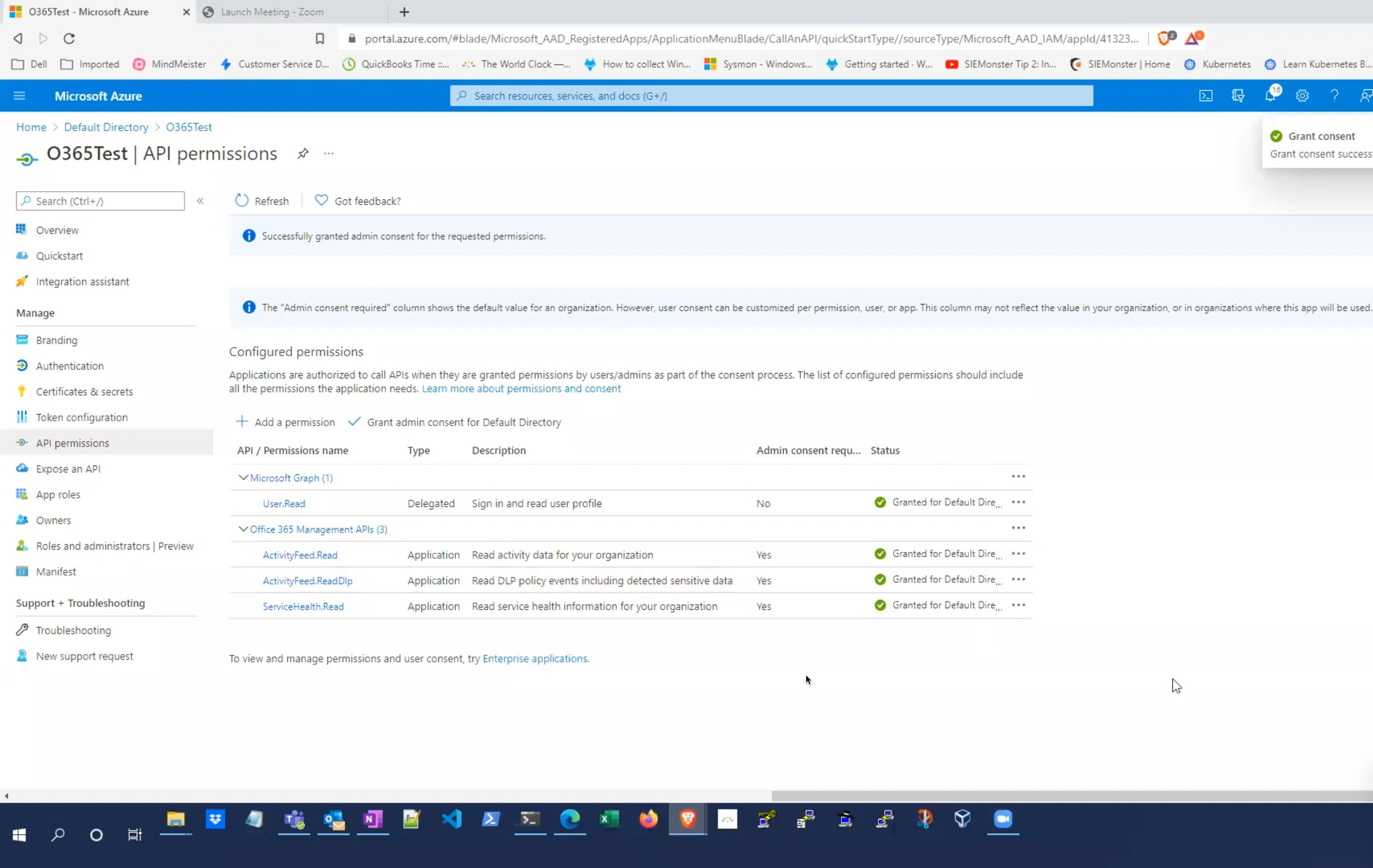 19. click the grant admin consent for default directories and then click yes and we should get four green checkmarks