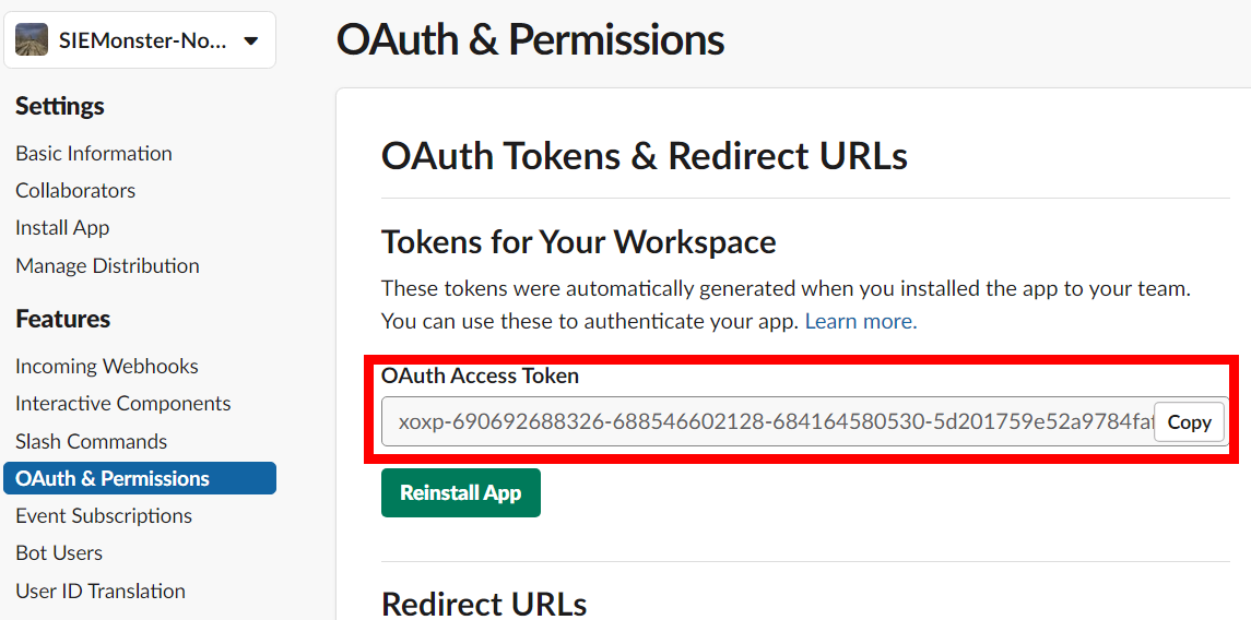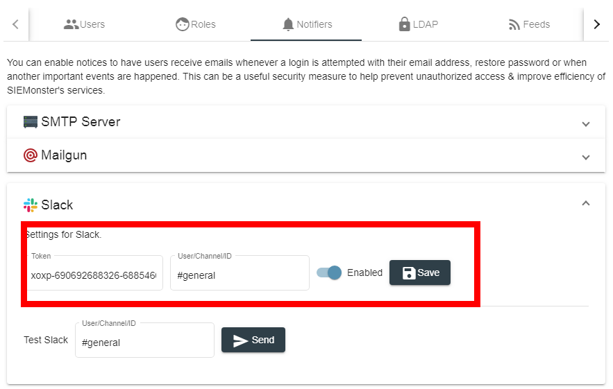 9. After installing you will be redirected to the previous page which will contain the required token. Save the token in SIEMonster's "Notifiers" tab: