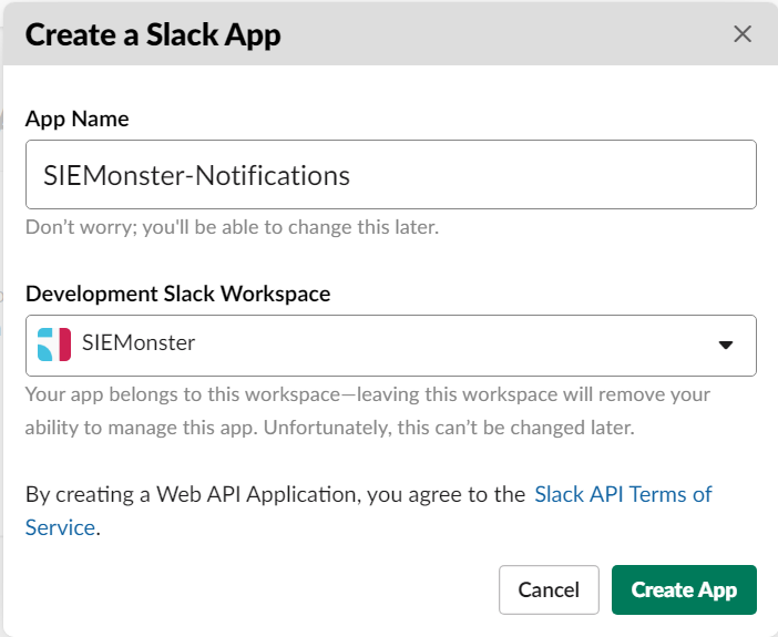 3. Fill in the “App Name” and “Development Slack Workspace” and click "Create App":