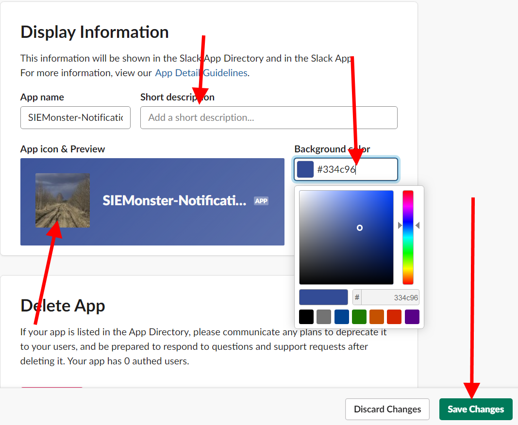 4. Scroll to the bottom of the opened page. Update the fields "Icon", "Background Color", "Short Description" and press "Save Changes" (Optional):