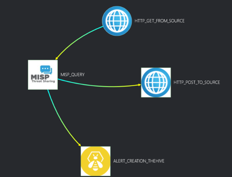 The first step is to perform a “GET” from the source. MiSP can then be queried with one or more of the variables obtained by the “GET” request. Once it completes, the flow can be split into two, “POST” the results back to the original source as well as create an alert in TheHive for further incident response activities.