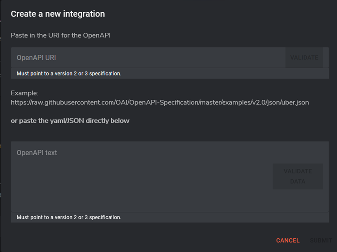 Specify the OpenAPI text that must be submitted and Click “Validate Data” when the button is highlighted.