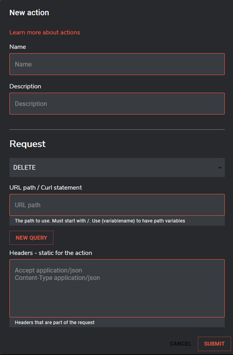 Once these items have been added, one or more actions may be added for the application to perform. The following fields are required:
