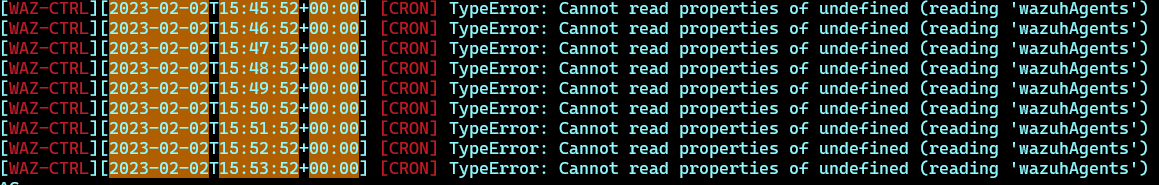 The line “TypeError: Cannot read properties of undefined (reading 'wazuhAgents')” indicates that the XDR controller cannot read the relevant data.